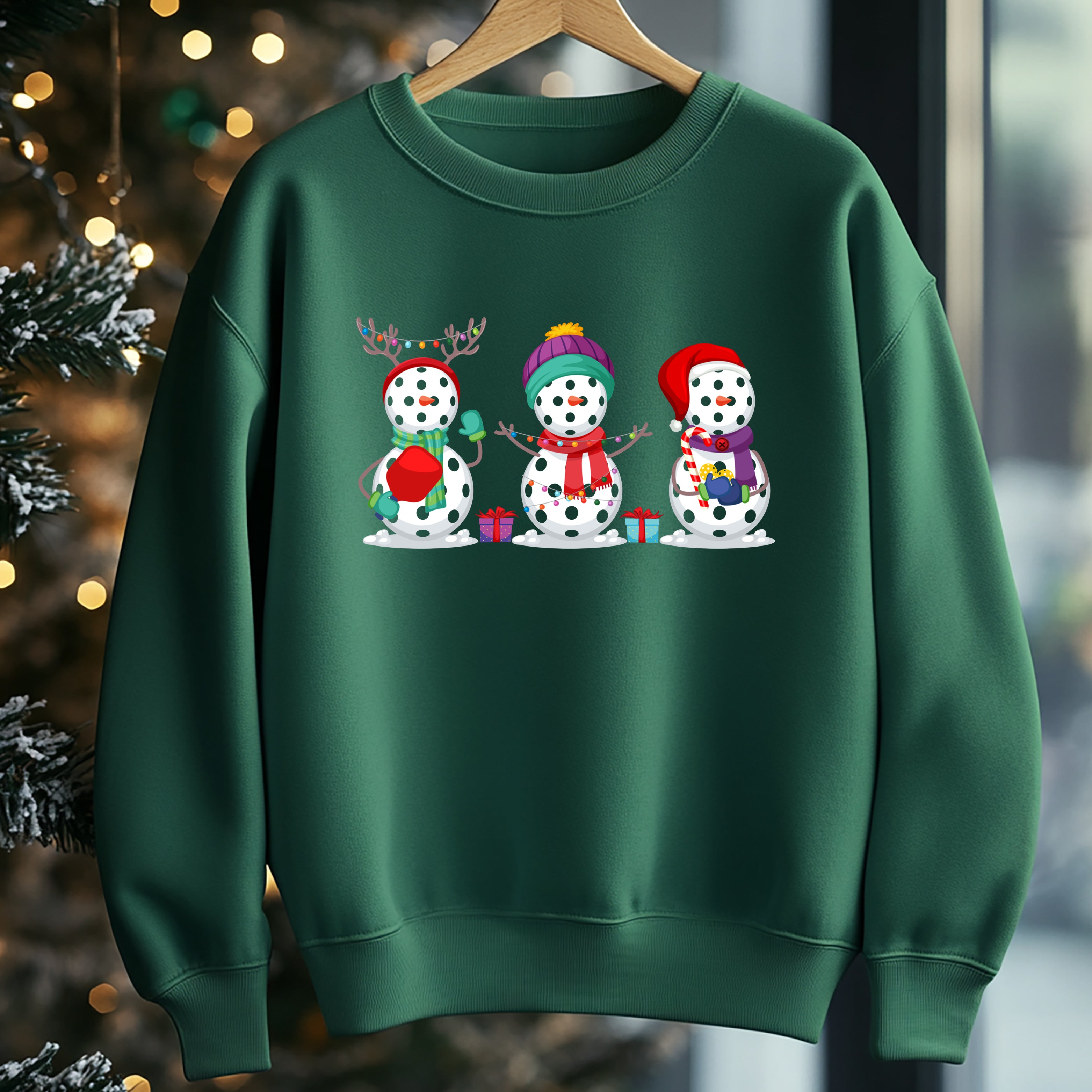 Shop Holiday TopsThree adorable pickleball snowmen wearing hats, scarves, and mittens bring instant holiday joy. Cute, colorful, and cozy—this sweatshirt is a fun winter gift for any pickleball lover.