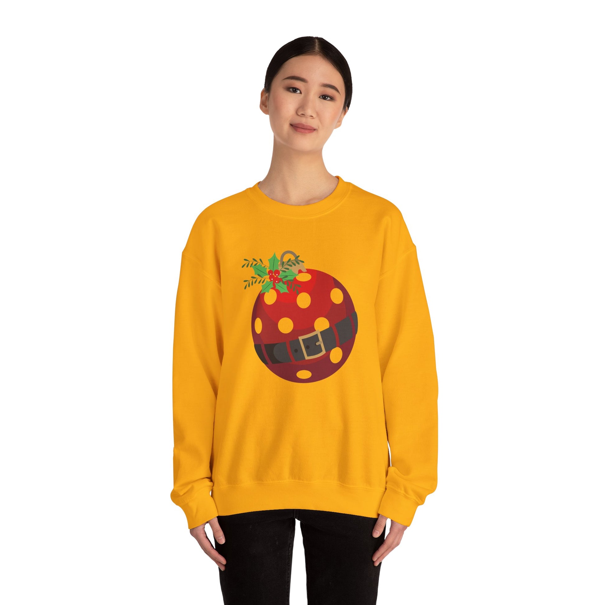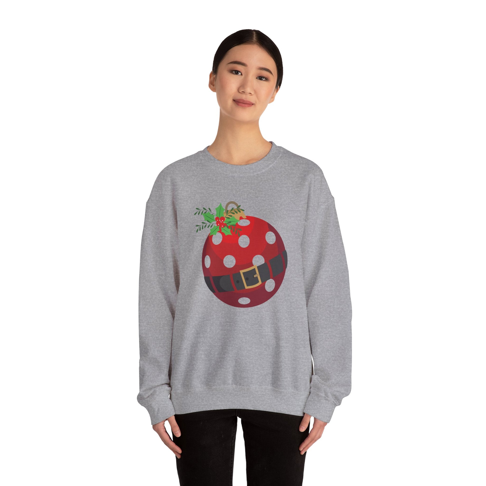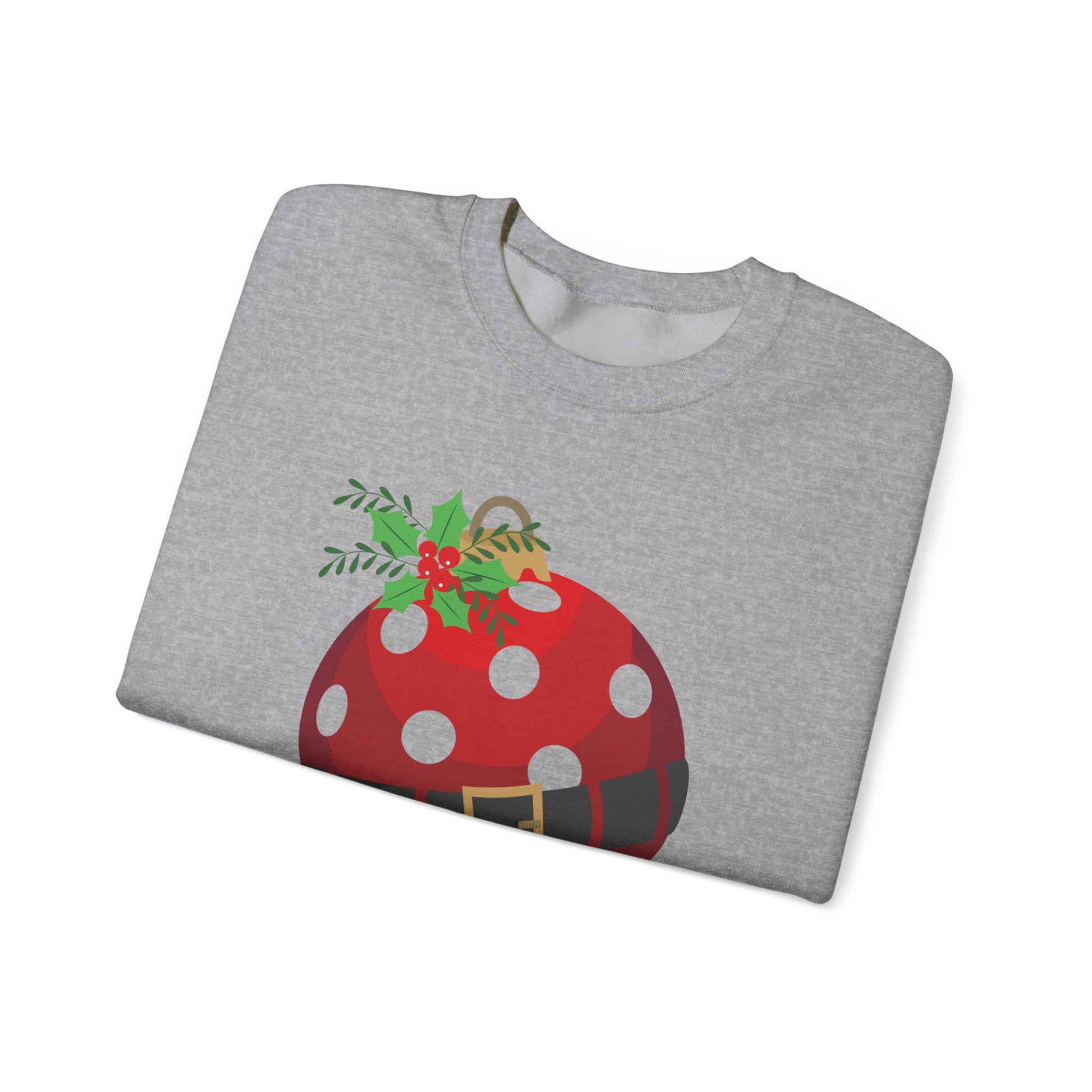 This cozy crewneck brings gentle holiday cheer without shouting. A soft white sweatshirt carries a playful ornament graphic — a red, polka-dotted bauble with a tiny holly sprig and a Santa-belt detail — centered on the chest. It reads as relaxed and whimsical, the kind of layer you pull on for slow mornings, cookie baking sessions, and neighborhood walks under string lights. The medium-heavy 50/50 cotton-poly blend feels substantial yet breathable; ribbed collar and double-needle stitching keep the shape season after season. Worn by someone who favors low-key festive details and comfort, it blends into quiet holiday routines while still feeling a little joyful.